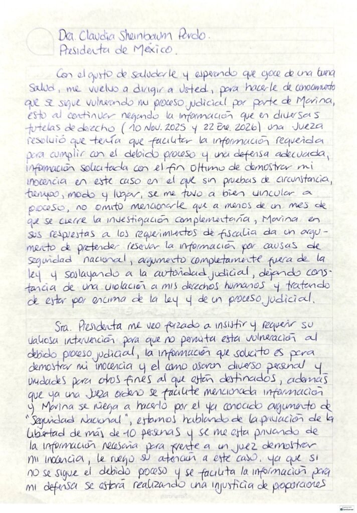 De acuerdo con lo expuesto en la carta, la negativa de la autoridad castrense persiste pese a que se encuentra próxima la conclusión de la etapa de investigación complementaria dentro del proceso penal. La defensa señala que la Secretaría de Marina ha justificado su negativa bajo un argumento genérico de “seguridad nacional”, el cual —según se indica— no ha sido avalado por la autoridad judicial competente y contraviene órdenes expresas emitidas por el órgano jurisdiccional.
