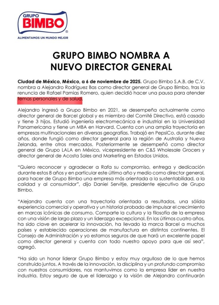 Grupo Bimbo, la empresa panificadora líder a nivel global, anunció el nombramiento de Alejandro Rodríguez Bas como su nuevo director general. Este movimiento se produce tras la decisión de Rafael Pamias Romero, quien asumió el cargo en abril de 2024, de tomar una pausa para atender asuntos personales y de salud, según informó la compañía a través de un comunicado oficial. El cambio en la máxima dirección busca garantizar la continuidad del liderazgo y la estrategia de la corporación.
