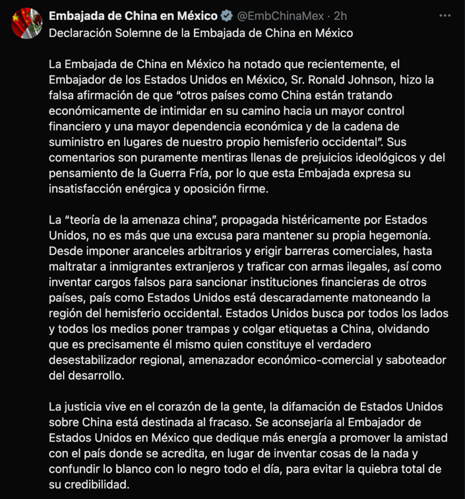 La respuesta del gobierno chino se hizo pública a través de un comunicado difundido desde la cuenta oficial de la embajada en México, luego de que Ronald Johnson afirmara que China intenta “intimidar económicamente en su camino hacia un mayor control financiero” y que promueve una “mayor dependencia económica” en países del hemisferio occidental.