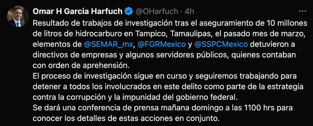 García Harfuch señaló que “el proceso de investigación sigue en curso y seguiremos trabajando para detener a todos los involucrados en este delito como parte de la estrategia contra la corrupción y la impunidad del gobierno federal”. El operativo se deriva de las investigaciones iniciadas después del aseguramiento masivo de hidrocarburo en marzo pasado, cuando autoridades federales interceptaron 10 millones de litros de combustible en operativos coordinados en la región de Tampico.