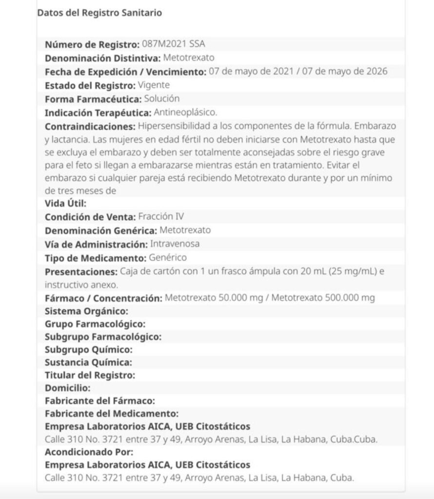 El Metrotexato es un medicamento esencial para el tratamiento de diversos tipos de cáncer y su desabasto pone en riesgo la vida de miles de pacientes. La asociación civil señaló que el medicamento cubano ya está siendo distribuido en hospitales públicos, aunque se desconoce si cumple con los estándares de calidad requeridos para este tipo de tratamientos.
