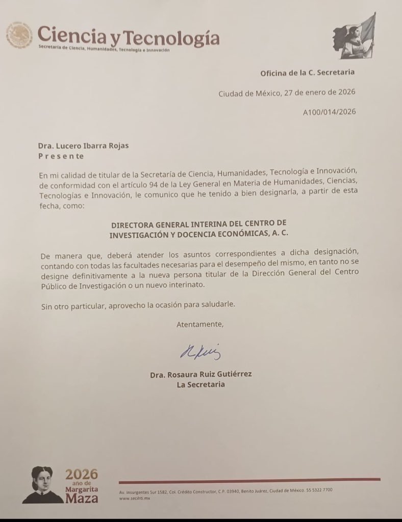 El cambio en la dirección fue formalizado mediante el oficio A100/014/2026, firmado por la titular de la Secihti, Rosaura Ruiz Gutiérrez. En el documento, la funcionaria precisó que la nueva directora general interina “deberá atender los asuntos correspondientes a dicha designación, contando con todas las facultades necesarias para el desempeño del mismo, en tanto no se designe definitivamente a la nueva persona titular de la Dirección General del Centro Público de Investigación o un nuevo interinato”.