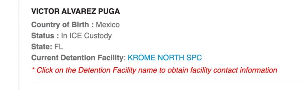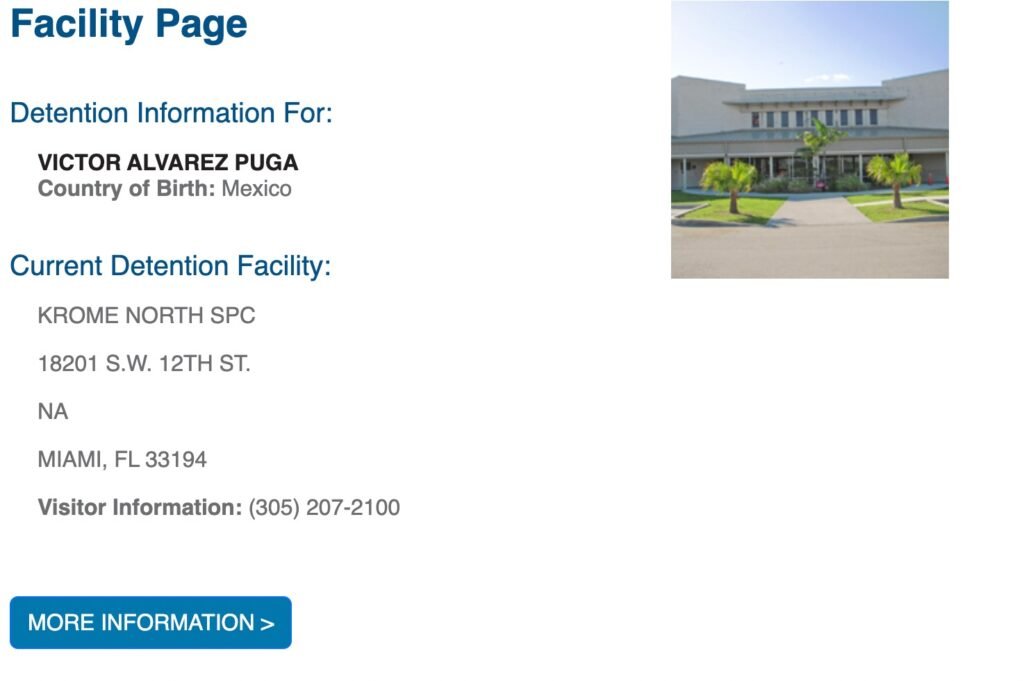 Registros oficiales del Servicio de Inmigración y Control de Aduanas (ICE) indican que Álvarez Puga se encuentra actualmente retenido en el Centro de Procesamiento de Servicios de Krome North, una instalación de detención de inmigrantes operada por esta agencia federal en el estado de Florida. Esta situación sugiere que la detención del empresario mexicano habría ocurrido inicialmente por alguna cuestión migratoria y no necesariamente como resultado directo del cumplimiento de una orden de detención con fines de extradición.