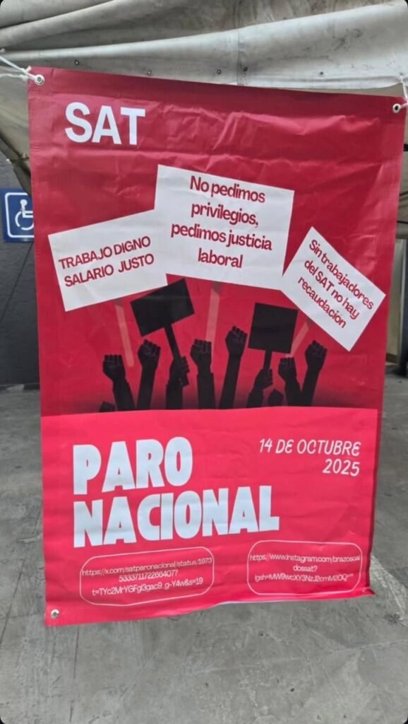 Este martes 14 de octubre de 2025, empleados del Servicio de Administración Tributaria (SAT) realizan un paro nacional bajo la modalidad de “brazos caídos” para exigir mejoras salariales y condiciones laborales, suspendiendo todas las actividades productivas mientras permanecen en sus centros de trabajo. El movimiento inició a las 8:00 a.m. y responde al incumplimiento del aumento salarial del 12% que, según los trabajadores, debía aplicarse desde enero de 2025 conforme al incremento aprobado para el salario mínimo general, además de denunciar precarización laboral por recortes de personal y eliminación de prestaciones.