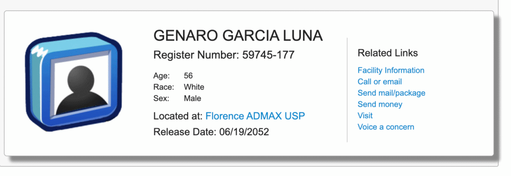 De acuerdo con datos oficiales del Buró Federal de Prisiones, García Luna se encuentra recluido con el número de registro 59745-177 en el centro de reclusión denominado oficialmente Florence ADMAX USP ubicado en el condado de Fremont, Colorado, cerca de la pequeña ciudad de Florence. Su fecha de liberación de esta instalación está programada para el 19 de junio de 1952.