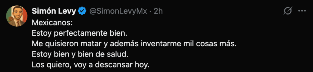 Por su parte, Simón Levy ha negado su detención y respondió al tema en su cuenta de X. “Mexicanos: Estoy perfectamente bien. Me quisieron matar y además inventarme mil cosas más. Estoy bien y bien de salud. Los quiero, voy a descansar hoy”, escribió el implicado en la red social. Además, en entrevista radiofónica con Luis Cárdenas, aseguró que está libre en Washington, D.C. y reiteró que sufrió un atentado pues sujetos intentaron dispararle, pero pudo resguardarse en su camioneta. “No estoy en México: que digan que fui detenido es una cortina de humo porque lo que realmente querían es matarme”, declaró Levy durante la entrevista, contradiciendo la versión oficial de las autoridades mexicanas sobre su situación legal actual y su ubicación geográfica.