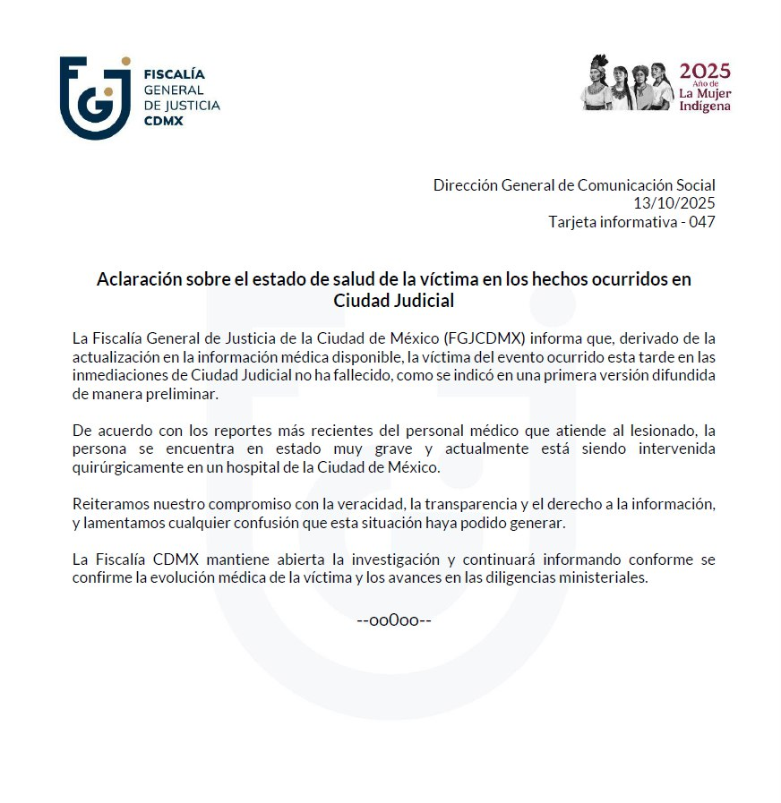 “De acuerdo con los reportes más recientes del personal médico que atiende al lesionado, la persona se encuentra en estado muy grave y actualmente está siendo intervenida quirúrgicamente en un hospital de la Ciudad de México”, detalló la Fiscalía en su comunicado de corrección. La institución añadió en su aclaración: “Reiteramos nuestro compromiso con la veracidad, la transparencia y el derecho a la información, y lamentamos cualquier confusión que esta situación haya podido generar”.