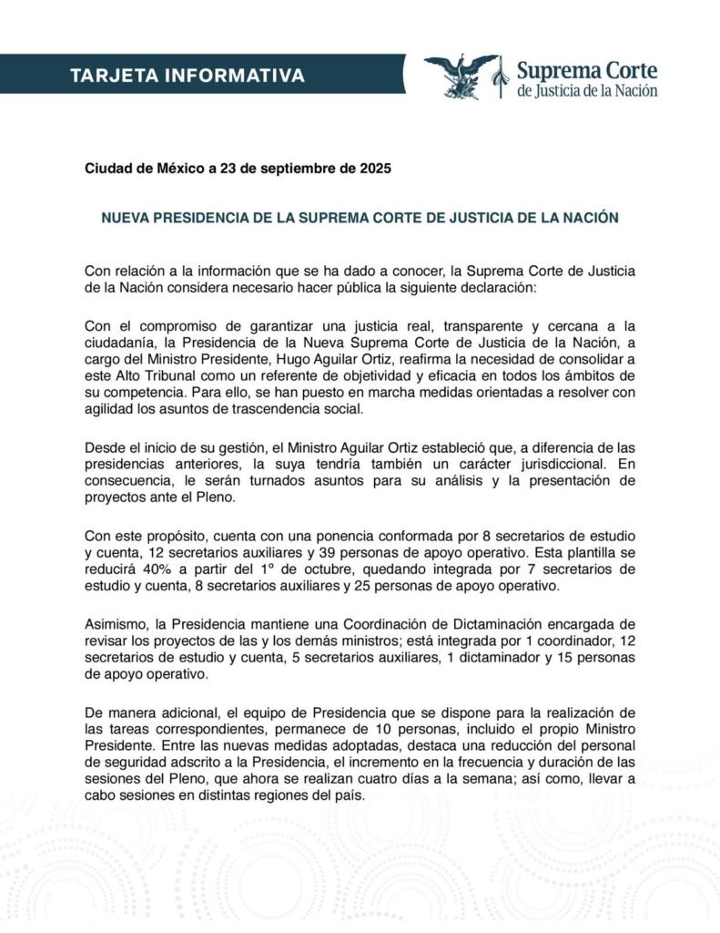 El ministro presidente de la Suprema Corte de Justicia de la Nación (SCJN), Hugo Aguilar Ortiz, confirmó que reducirá el personal adscrito a la Presidencia del máximo tribunal, pasando de 104 a 84 trabajadores a partir del 1 de octubre luego de recibir críticas por el gran número de asesores con los que cuenta. Mediante un comunicado oficial, la Corte detalló que la medida forma parte de las acciones para consolidar al organismo como “un referente de objetividad y eficacia” y responde al carácter jurisdiccional que Aguilar Ortiz ha establecido para su gestión, a diferencia de administraciones anteriores.