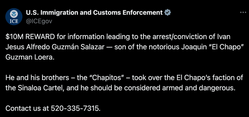 El Servicio de Inmigración y Control de Aduanas de Estados Unidos (ICE) anunció una recompensa de diez millones de dólares por información que lleve al arresto o condena de Jesús Alfredo Guzmán Salazar, hijo de Joaquín “El Chapo” Guzmán. Las autoridades consideran a Guzmán Salazar armado y peligroso, ya que él y sus hermanos, conocidos como Los Chapitos, tomaron el control de la facción de su padre dentro del Cártel de Sinaloa.