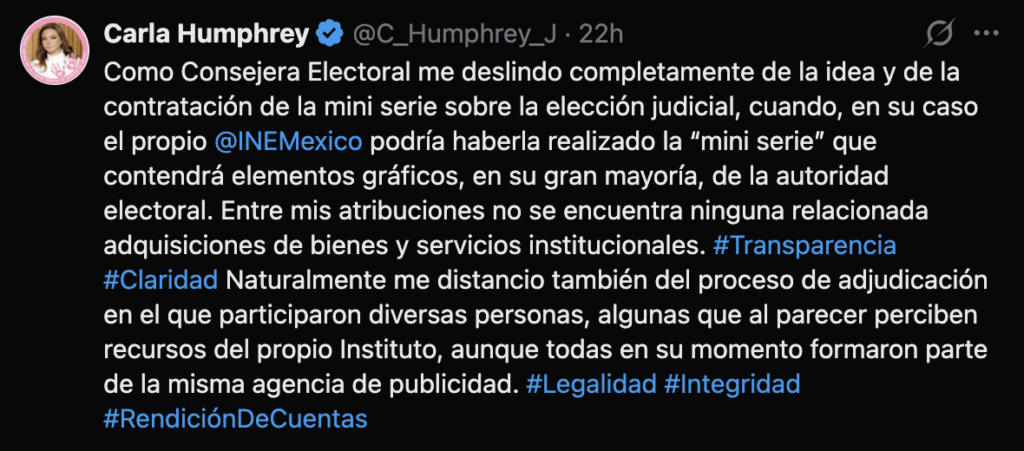 Desde su cuenta de X, la consejera Humphrey reaccionó a una nota de la periodista Andrea Meraz, publicada el 21 de enero en Fórmula Noticias, en la que se dio a conocer que el contrato fue asignado a Gilberto Solís Mendívil, vinculado a los desvíos de recursos operados a través del Sistema de Radio y Televisión de Hidalgo en el caso de la Estafa Maestra. Humphrey afirmó que se deslinda “completamente de la idea y de la contratación de la mini serie”.