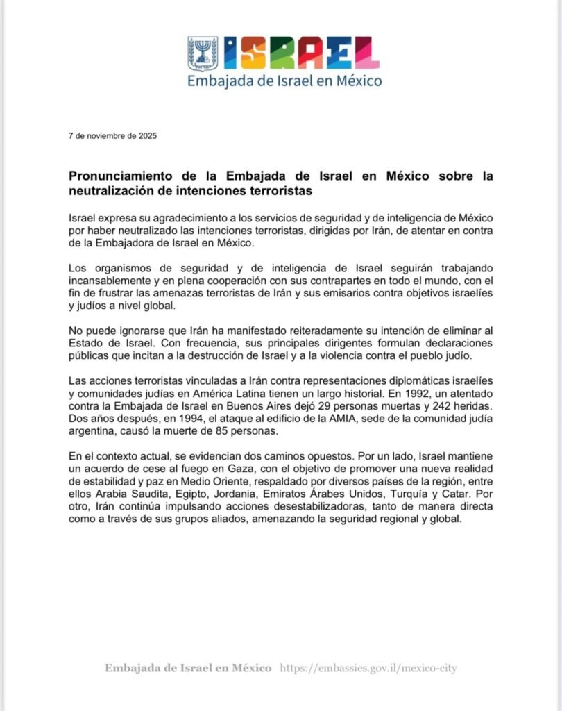 A través de un comunicado oficial, Israel expresó su agradecimiento al Gobierno de México y a sus servicios de seguridad e inteligencia por haber neutralizado las intenciones terroristas dirigidas por Irán que tenían como objetivo atentar contra la embajadora de Israel en México. El reconocimiento fue emitido tras confirmarse que las autoridades mexicanas impidieron la ejecución del ataque, cuya planeación fue atribuida a estructuras vinculadas a intereses iraníes.