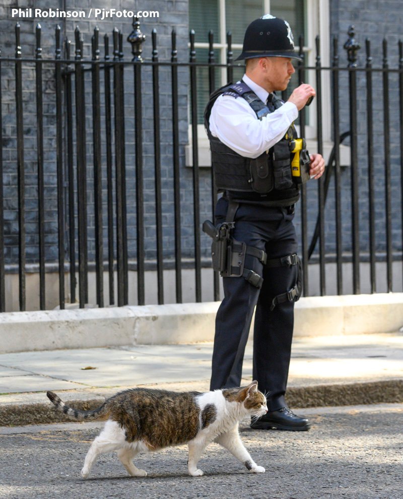 En julio de 2016, cuando Theresa May asumió como primera ministra, Larry ya tenía fama de ser «agresivo» en sus interacciones con otros ratoneros, en particular con Palmerston, el gato más joven del Foreign Office. A pesar de estos episodios, continuó en su cargo como Ratonero Jefe de la Oficina del Gabinete.