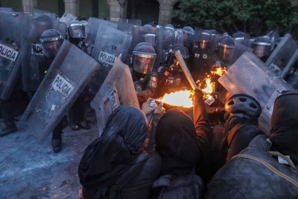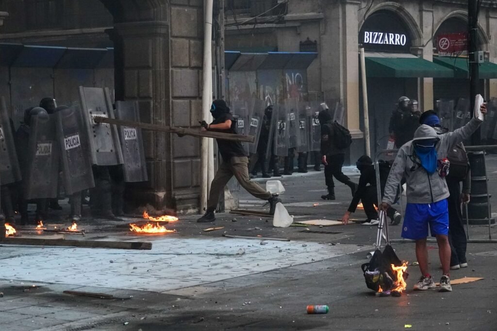 En la zona de Bellas Artes, un grupo de encapuchados lanzó petardos, piedras y latas de pintura contra elementos de la Secretaría de Seguridad Ciudadana (SSC). En respuesta, los uniformados avanzaron con escudos para encapsular a los manifestantes y evitar mayores daños.