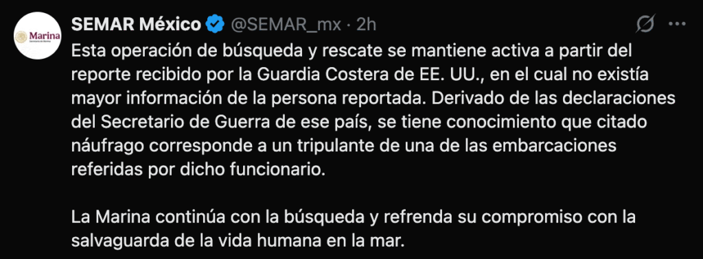 En su comunicado, la Marina aclaró que la solicitud inicial de auxilio proveniente de la Guardia Costera estadounidense no incluía información sobre la identidad ni el contexto de la persona buscada. No fue sino hasta después de la publicación del secretario de Defensa de Estados Unidos, Pete Hegseth, en la red social X, que la dependencia mexicana supo que el náufrago correspondía a un sobreviviente del bombardeo realizado por las fuerzas estadounidenses contra cuatro embarcaciones sospechosas de tráfico de drogas en aguas internacionales del Pacífico oriental.