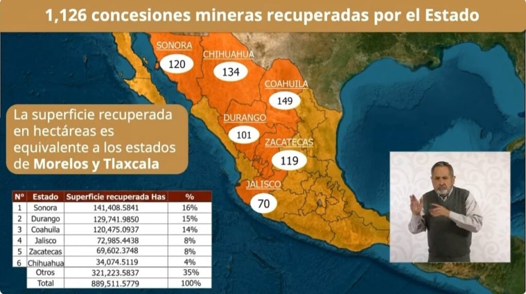 Las cancelaciones se concentraron principalmente en Sonora, Durango, Coahuila, Jalisco, Zacatecas y Chihuahua, entidades donde se desarrolla la mayor parte de la actividad minera mexicana. Además, dentro de esta iniciativa de recuperación se identificaron 713 concesiones que abarcan 249 mil 108 hectáreas ubicadas en Áreas Naturales Protegidas (ANP).