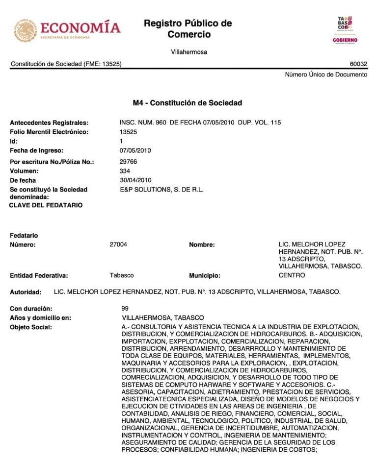 La empresa E&P Solutions, constituida en la notaría 13 por Melchor López Hernández, compartía accionistas y representantes legales con Surface Technology. En su acta fundacional aparecen una mujer de Venezuela y un hombre que declaró ser empleado y residente de la colonia Casablanca en Villahermosa, una de las zonas más pobres del estado.