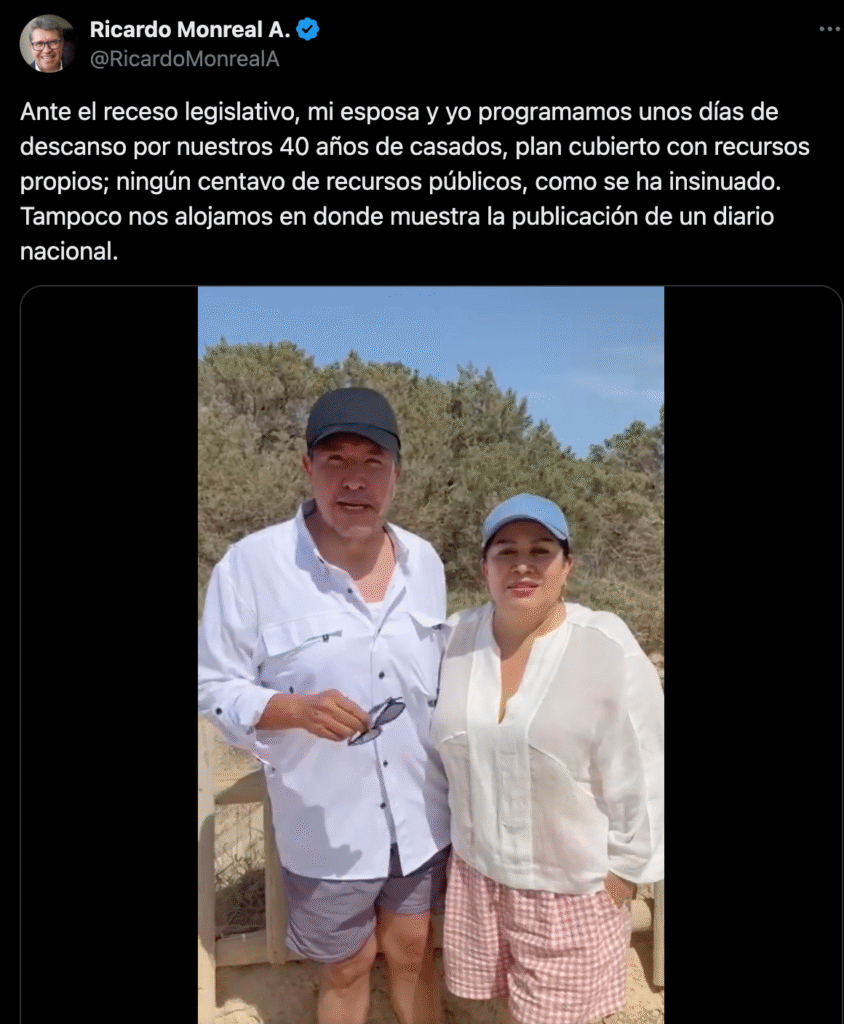 Monreal, coordinador de la bancada de Morena en la Cámara de Diputados, había sido captado en un exclusivo restaurante madrileño durante el receso legislativo, lo que generó cuestionamientos por contraste con la política de sencillez que pregona el partido oficialista. El diputado defendió su viaje a través de un video, explicando que celebró sus 40 años de matrimonio con recursos propios y en un periodo sin responsabilidades parlamentarias. “Tenemos derecho a pasear unos días con nuestros propios recursos”, afirmó el legislador.